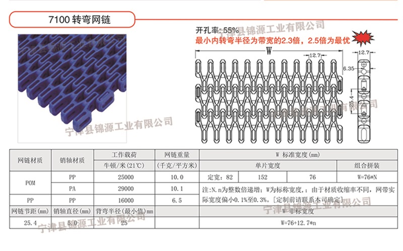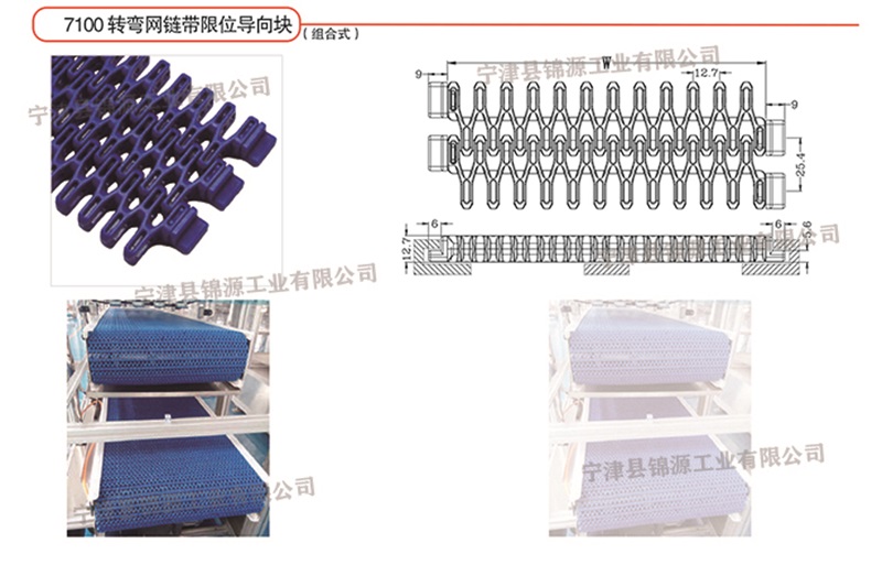 7100型轉彎網帶 開孔、平板、凸筋、滾珠、防滑形式,解決皮帶不跑偏,更換難等問題。